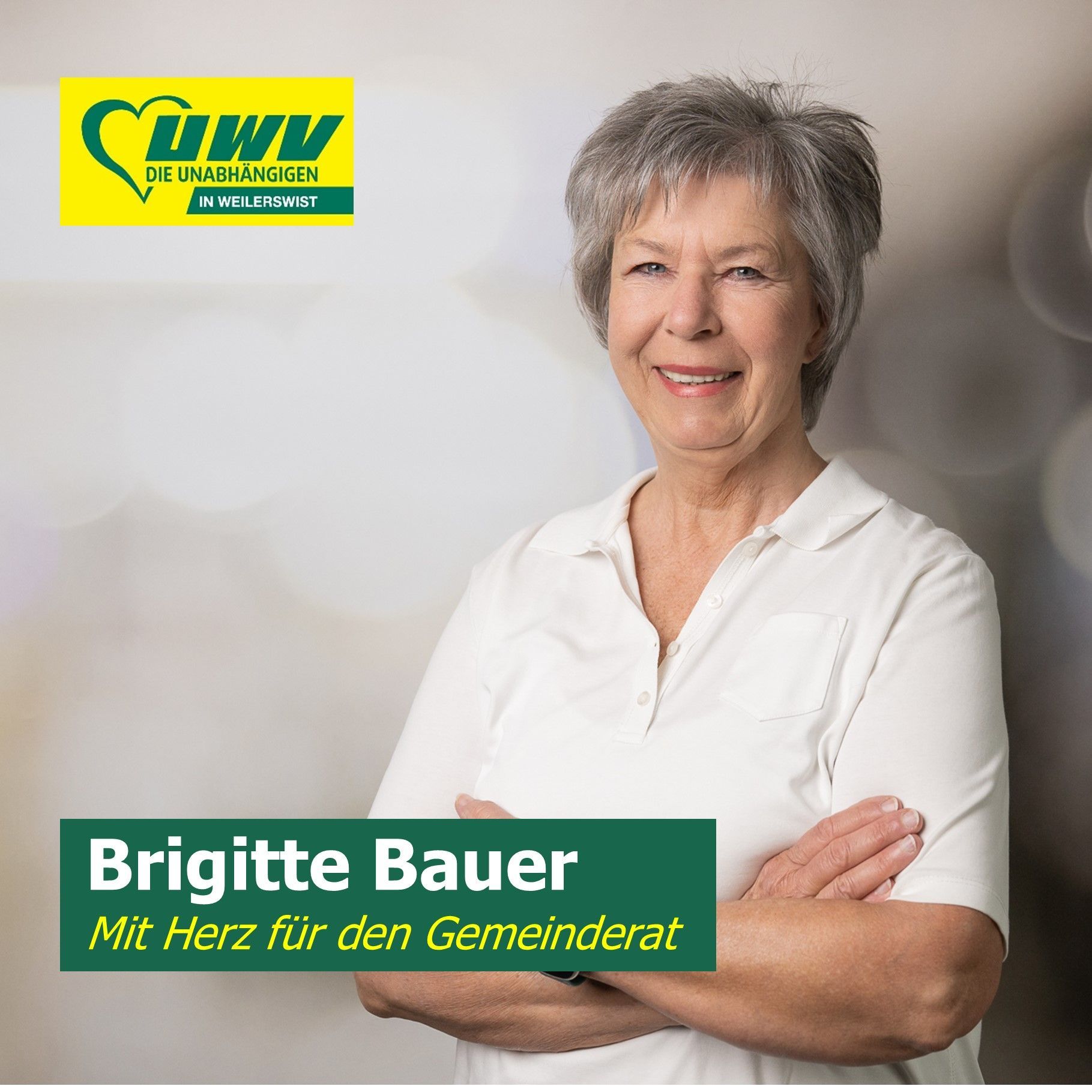 Brigitte Bauer ist durch verschiedene ehrenamtliche Tätigkeiten mit der Gemeinde verbunden. Sie ist in der UWV bereits mit kommunalpolitischer Arbeit vertraut. Im Vorstand des Gemeindeverbandes ist sie Schriftführerin, für die Fraktion im Gemeinderat ist sie als sachkundige Bürgerin in verschiedenen Ausschüssen des Rates aktiv.