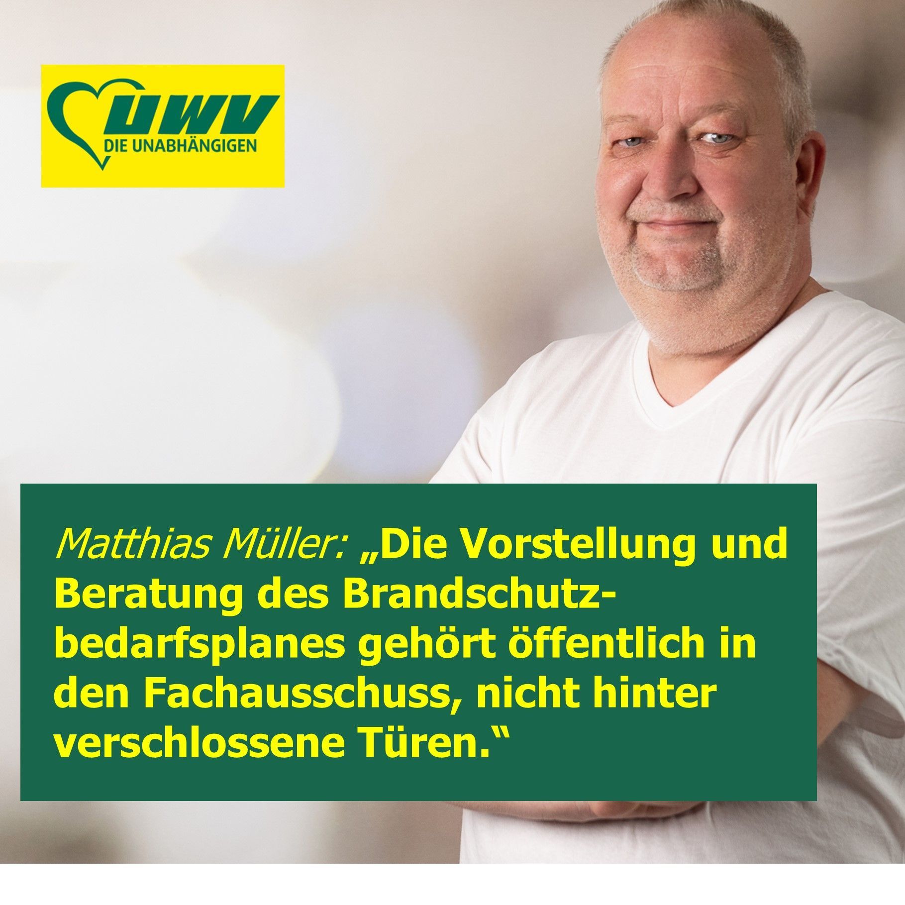 Wesentliche Diskussionen gehören dorthin wo sie nach Geschäftsordnung zugewiesen, in den Fachausschuss und zwar in öffentlicher Sitzung. „Die Unabhängigen“ werden keine „Schatten-Ausschüsse“ zur Grundlage von Entscheidungen machen. Die UWV wird den Brandschutzbedarfsplan mit der gebotenen Seriosität beraten und sich mit weiteren Experten dazu austauschen. Demnach wird man eine Vertagung in den Fachausschuss beantragen, andernfalls müsse man mangels ausreichender Beratungszeit zunächst gegen die Verwaltungsvorlage votieren müssen.