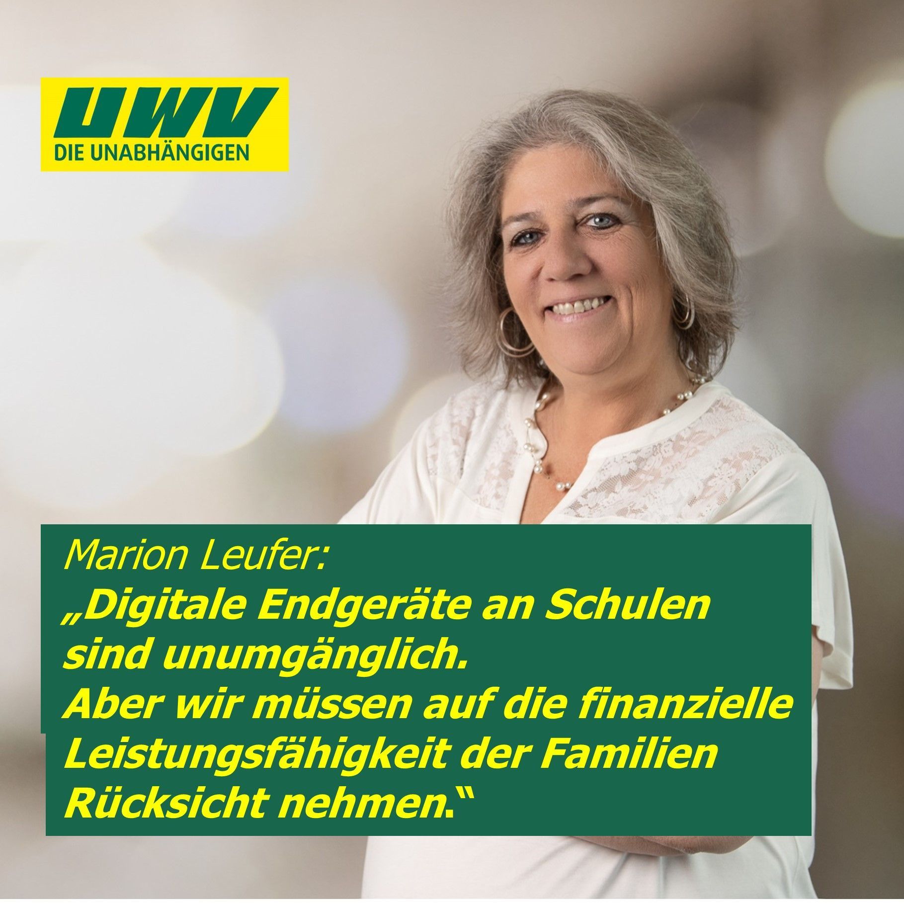 UWV-Ratsmitglied Marion Leufer ergänzt: „Eine Kostenbeteiligung durch die Eltern sehen wir als UWV grundsätzlich sehr kritisch. Auch, wenn es für Familien mit geringem Haushaltbudget Vergünstigungen und Zuschüsse geben soll. Alleine der Schritt an die Verantwortlichen heran, sich als finanziell schlechter gestellte Familien zu outen, sehen wir als problematisch. Und auch dann heißt es noch lange nicht, dass diese Familien dann nach Gewährung von Zuschüssen und Vergünstigungen, nicht dennoch vor einer finanziellen Herausforderung stehen.“