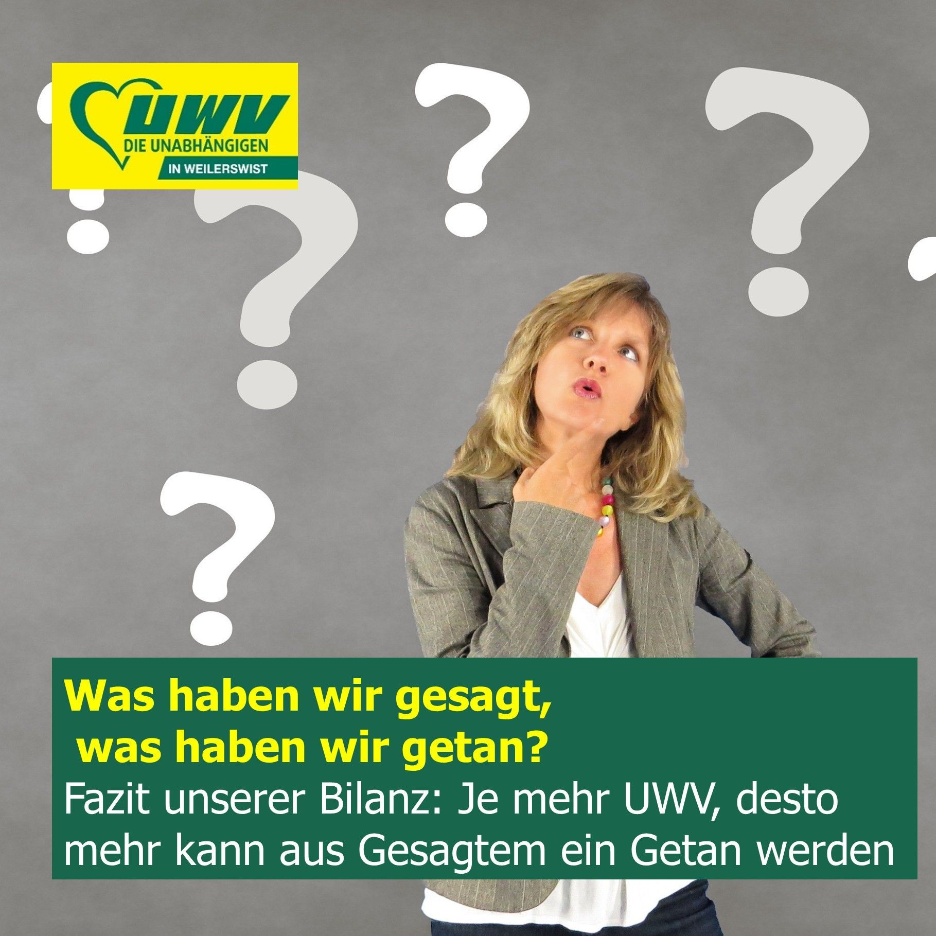 Getan: Neben verschiedenen Initiativen im Rat und seinen Ausschüssen, die oftmals an den aktuellen Mehrheiten gescheitert sind sowie regelmäßigen öffentlichen Berichten bringt die UWV mit "Weilerswist kompakt" seit fünf Jahren eine eigene Informationsbroschüre heraus. Jahr für Jahr wird es überarbeitet, lesefreundlicher gestaltet und mittlerweile nahezu flächendeckend verteilt – finanziert ausschließlich durch die UWV und deren Mitglieder, ohne Steuergelder.