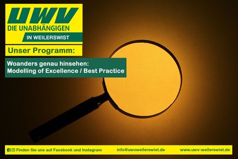 Den vielen Herausforderungen, vor denen wir heute stehen, müssen wir uns stellen. Es gilt, die Frage zu beantworten, wo und wie wir uns als Gemeinde besser aufstellen können. Wir sprechen uns als Unabhängige Wähler-Vereinigung für das sog. „Modelling of Excellence“ aus. Ein Begriff, der sich neu „gefunden“ hat, den man früher vielleicht einfach mit „abgucken“ übersetzt hätte.
