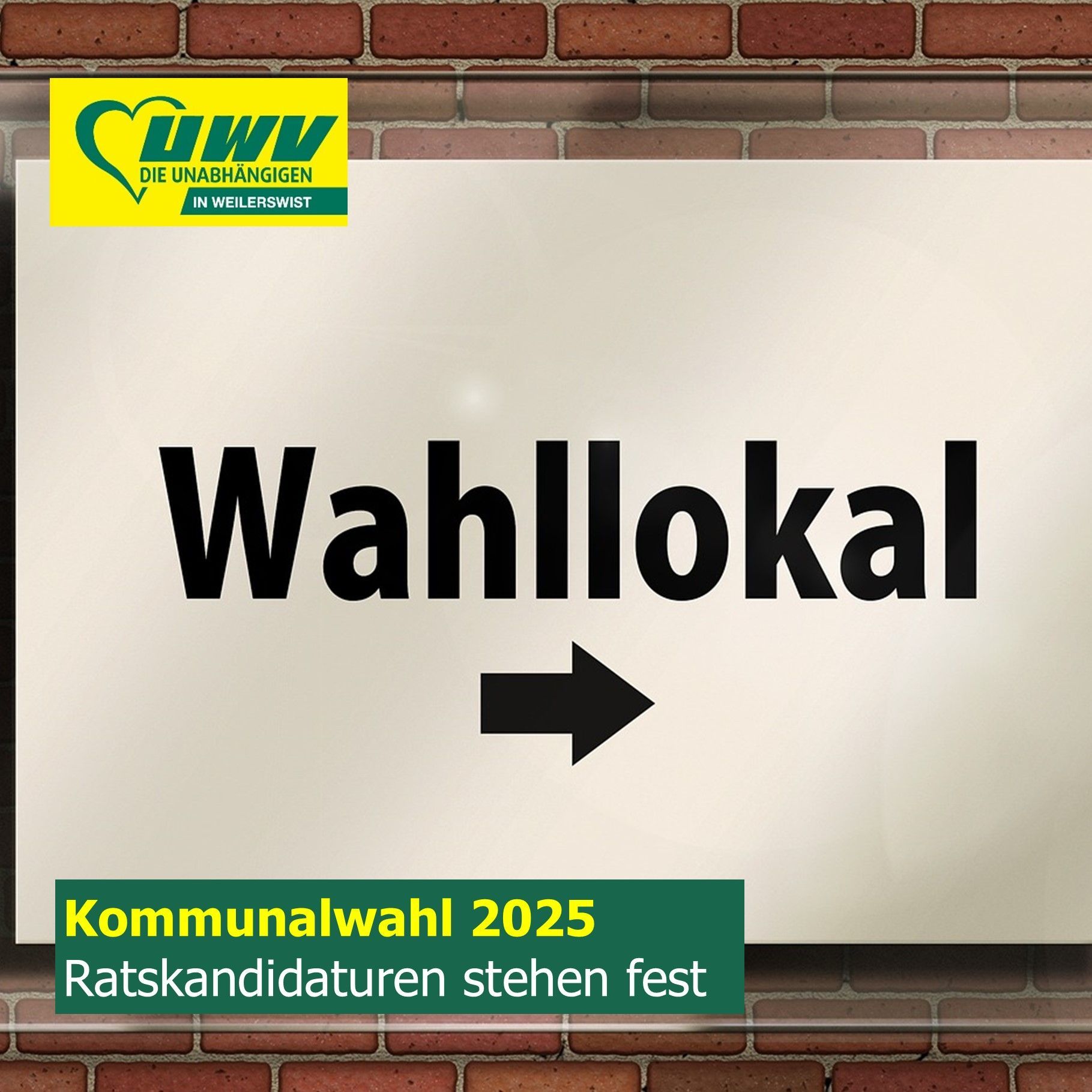 Die Mitgliederversammlung der UWV Weilerswist hat ihre Kandidatinnen und Kandidaten für die Kommunalwahl 2025 aufgestellt und am 07.05. für alle 15 Wahlbezirke nominiert. Ebenfalls wurde die Reserveliste sowie das Wahlprogramm verabschiedet.