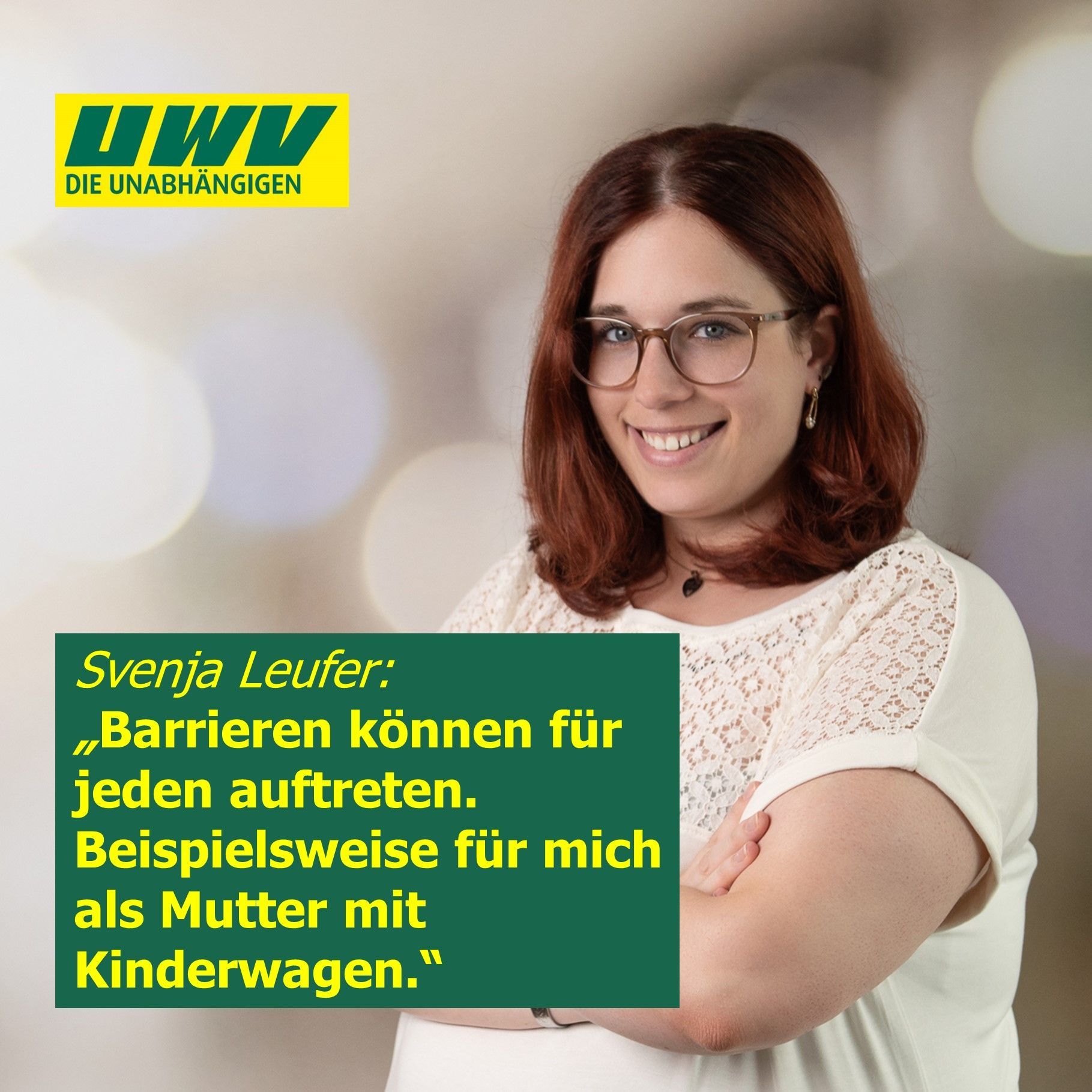 Svenja Leufer, sachkundige Bürgerin der UWV: „Wir wissen, eine gänzliche Barrierefreiheit mag es nicht geben. Die Hilfssysteme für die einen, können für die anderen zum Problem werden. Etwa taktile Leitsysteme. Für Sehbehinderte hilfreich, für Rollstühle und Kinderwagen nicht zwingend. Es kommt aber darauf an eine kluge Abwägung der gegenseitigen Interessen aller Personengruppen zu erreichen.“