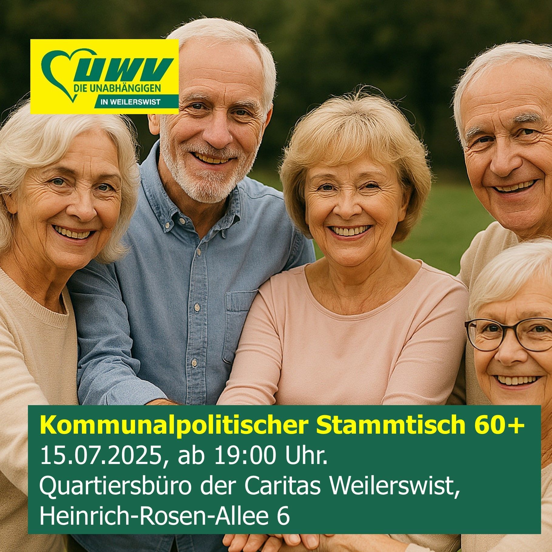 treffen wir uns zu unserem Stammtisch 60+ im Caritas Quartiersbüro Weilerswist, Heinrich-Rosen-Alle 6, Weilerswist.