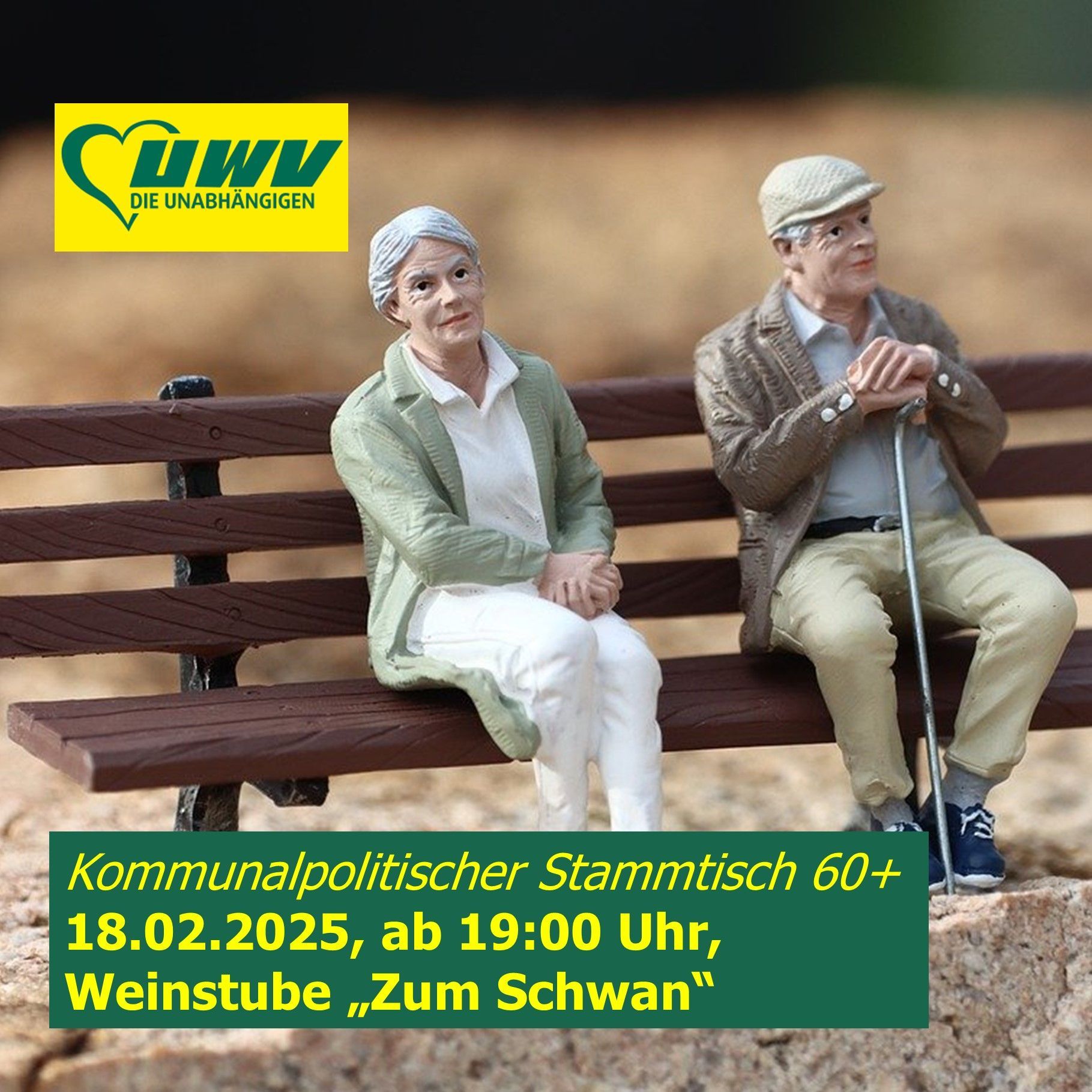 Am 18.02.25 um 19:00 Uhr laden wir, die Unabhängigen Wähler (UWV), zum Stammtisch 60+ in die historische „Weinstube Zum Schwan“, Kölner Str. 99 in Weilerswist ein.