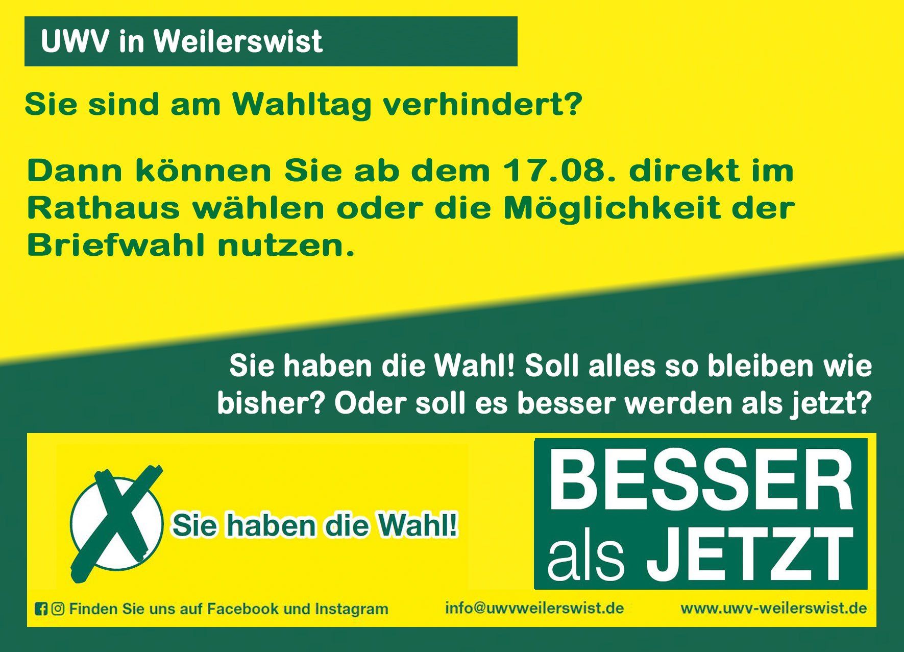 Der nächste Rat der Gemeinde Weilerswist wird 30 Mitglieder haben. Nach dem Kommunalrecht wird die Hälfte der Sitze in den Wahlkreisen direkt vergeben. Dies meint: Sie haben als Wähler/in eine Stimme. Damit wird die Person in Ihrem Wahlkreis direkt in den Rat gewählt, welche die einfache Mehrheit aller Kandidatinnen und Kandidaten in Ihrem Wahlkreis erhalten hat.