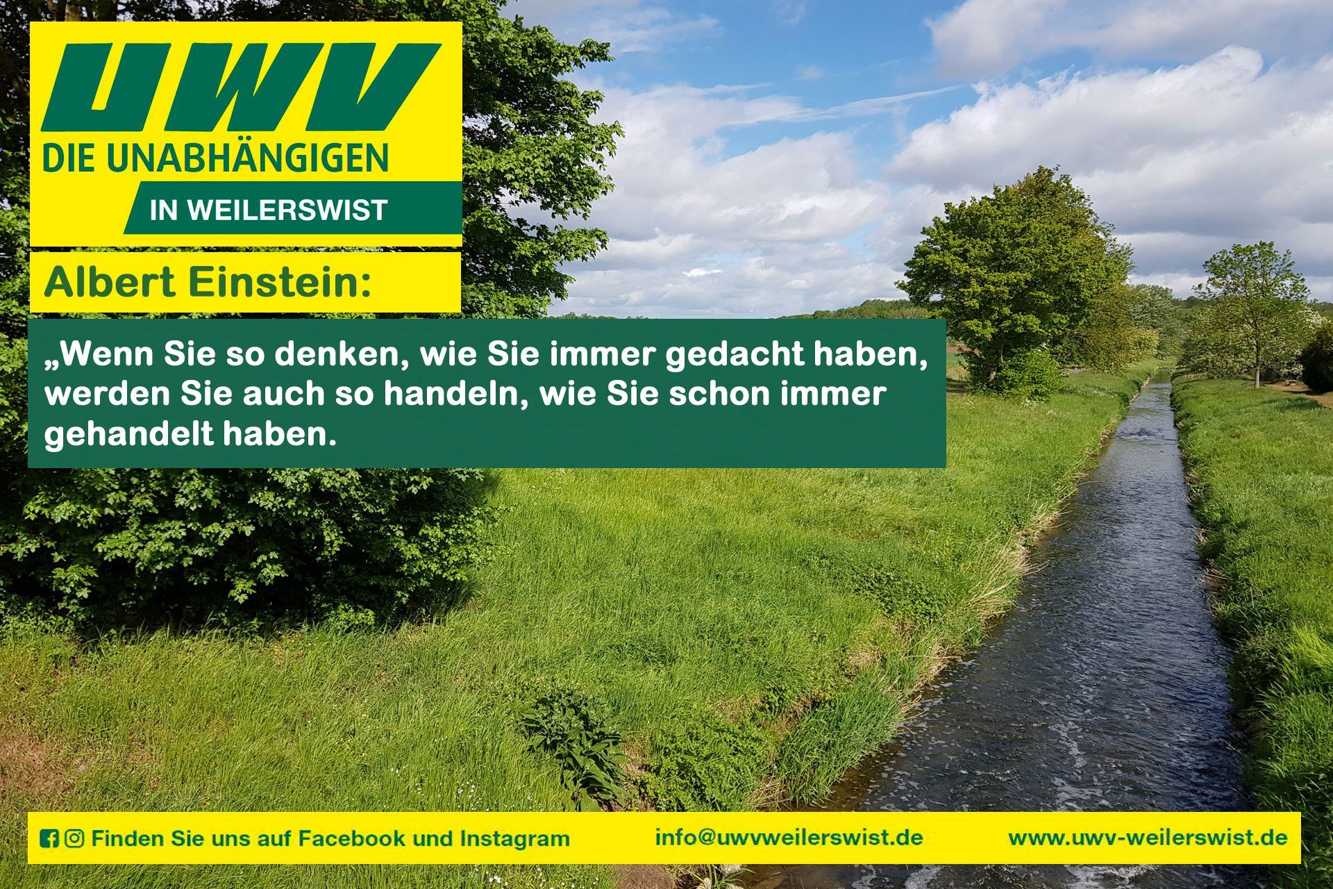 Dieses Zitat soll von keinem geringerem stammen, als Albert Einstein. Für uns als „Unabhängige“ bildet es den Einstieg in unser Kommunalwahlprogramm. In den folgenden Wochen wollen wir Ihnen die einzelnen Themenbereiche unseres Programms näher bringen. Es gibt Menschen in unserer Gemeinde, die an ganz unterschiedlichen Stellen behaupten, die UWV hätte keine Inhalte, das sei doch alles recht dünn. Dies haben wir seit unserer Gründung Ende 2019 schmunzelnd zur Kenntnis genommen und stattdessen, unbeirrt von derart falschen Darstellungen, unsere Ideen auf unterschiedlicher Weise mit Bürgerinnen und Bürgern diskutiert: in persönlichen Gesprächen, bei offenen Vorstandssitzungen und dergleichen. Bis uns Corona einen Strich durch weitere Veranstaltungen gemacht hat. Wir wissen: es gibt kein Patentrezept für ein perfektes Weilerswist. Aber: mit Herz und Verstand, einem Stück klarer Kante und dem Mut zu ambitionierten Zielen ist unser Programm entstaDieses Zitat soll von keinem geringerem stammen, als Albert Einstein. Für uns als „Unabhängige“ bildet es den Einstieg in unser Kommunalwahlprogramm. In den folgenden Wochen wollen wir Ihnen die einzelnen Themenbereiche unseres Programms näher bringen. Es gibt Menschen in unserer Gemeinde, die an ganz unterschiedlichen Stellen behaupten, die UWV hätte keine Inhalte, das sei doch alles recht dünn. Dies haben wir seit unserer Gründung Ende 2019 schmunzelnd zur Kenntnis genommen und stattdessen, unbeirrt von derart falschen Darstellungen, unsere Ideen auf unterschiedlicher Weise mit Bürgerinnen und Bürgern diskutiert: in persönlichen Gesprächen, bei offenen Vorstandssitzungen und dergleichen. Bis uns Corona einen Strich durch weitere Veranstaltungen gemacht hat. Wir wissen: es gibt kein Patentrezept für ein perfektes Weilerswist. Aber: mit Herz und Verstand, einem Stück klarer Kante und dem Mut zu ambitionierten Zielen ist unser Programm entstanden. Ein solches, gezielt auf Weilerswist zugeschnittenes Papier, haben wir bei anderen weder in der Vergangenheit noch aktuell gefunden. Wir sehen schon jetzt, nach der sukzessiven Veröffentlichung des Programms auf unserer Homepage, dass so mancher unserer Ansätze bereits von anderer Seite aufgegriffen wird: seien es Blumenwiesen, mehr Bäume und Grün in unserer Gemeinde oder ein sensiblerer Umgang mit Wahlplakaten als in der Vergangenheit. Wir freuen uns in der Sache, dass von uns schon zu Jahresbeginn angesprochene Themen nun auch Stück für Stück von anderen Parteien, Kandidatinnen und Kandidaten aufgegriffen werden. Ab nächster Woche werden wir wöchentlich ein Thema unseres Programms herausheben, damit Sie sich ein genaueres Bild von unseren Vorstellungen machen können. Natürlich finden Sie dieses, als komplette Langfassung, bereits seit ein paar Wochen auf unserer Homepage. Selbstverständlich werden wir zudem in Kürze auch unsere einzelnen Kandidatinnen und Kandidaten vorstellen. Wir wollen etwas verändern und dafür bedarf es neuer Ansätze. Wir stehen dazu, dass viele unserer Ansätze gewiss ambitioniert sind. Wir finden jedoch, dass es bisher an solchen gestalterischen Visionen in und für Weilerswist weitestgehend mangelt. Wir wollen anderes Handeln, neues Denken in die Politik einbringen. Nur so kann es besser werden. Dafür treten wir bei der Kommunalwahl an und werben um Ihr Mitwirken: Ihre Stimme! Sie haben die Wahl!