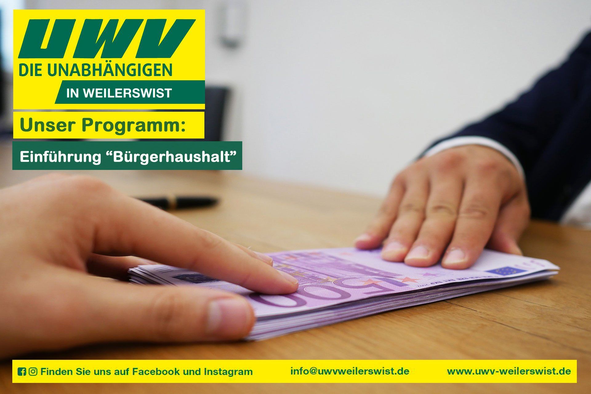 In der heutigen Folge unserer Bilanz blicken wir auf unsere Aussagen im Wahlprogramm 2020 zum Aspekt "Bürgerbeteiligung bei den Finanzen der Gemeinde". Was haben wir, wie im Wahlprogramm angekündigt, initiiert und was ist daraus geworden? Gesagt: Wir stehen für mehr Beteiligung und Transparenz in der Kommunalpolitik. Deshalb war es für uns nur konsequent, einen kommunalen Bürgerhaushalt vorzuschlagen – ein Instrument, das Bürgerinnen und Bürger direkt in Haushaltsentscheidungen einbindet. Zahlreiche Städte machen damit gute Erfahrungen. Warum also nicht auch Weilerswist? Getan: Am 20. Januar 2021 haben wir den Antrag gestellt: Die Verwaltung sollte in enger Abstimmung mit Politik und Bürgerschaft ein Konzept für einen Bürgerhaushalt ab dem Haushaltsjahr 2023 erarbeiten. Wir wollten wissen: Was geht? Wie kann es funktionieren? Und was können wir von anderen Kommunen lernen? Doch der politische Wille der Mehrheit fehlte. Trotz intensiver Beratung wurde unser Antrag im zuständigen Ausschuss zunächst vertagt – und schließlich abgelehnt. Als Gründe wurden unter anderem mangelndes Interesse und organisatorischer Aufwand genannt. Für uns kein Grund, das Thema ad acta zu legen. Ergebnis 2025: Die UWV hat das beschriebene Ziel aus dem Wahlprogramm nicht erreicht, weil sie am Widerstand aller anderen Fraktionen scheiterten. Fazit: Kein Grund mit hoffentlich anderen Mehrheitsverhältnissen in der neuen Wahlperiode erneut Lösungsmöglichkeiten zu erörtern (und mit hoffentlich einer stärkeren UWV zu beschließen), wie die Bürgerschaft beim Einsatz der zur Verfügung stehenden Finanzmittel künftig mitentscheiden kann.