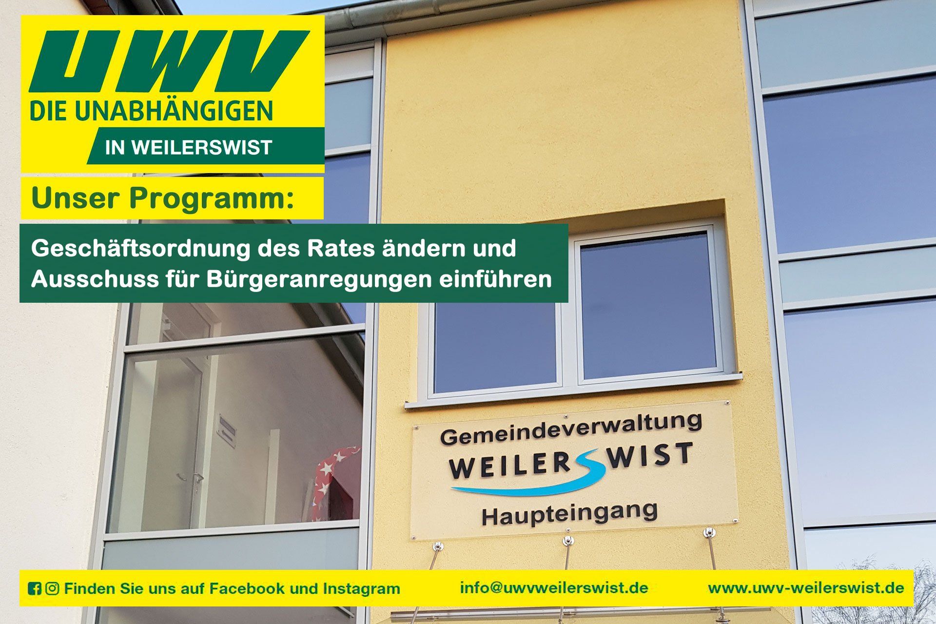 Es ist an der Zeit nun über unser Wahlprogramm 2025 zu informieren. Dies werden wir fortan Kapitel für Kapitel vorstellen. Heute starten wir mit der Einleitung unseres Programms: Vorwort Viele Menschen haben ihr Vertrauen in die kommunale Politik verloren. Das Klima in Rat und Verwaltung ist in Weilerswist weiterhin nicht das Beste. Rat und Verwaltung agieren zu selten geschlossen Seite an Seite. Das Verständnis von Transparenz und Vertrauen, für die UWV von besonderer Bedeutung, ist bei manchen handelnden Personen leider gering ausgeprägt. Dies führt insgesamt zu einer für uns deutlich wahrnehmbaren Resignation. Weiterhin haben unserer Überzeugung nach viele Bürgerinnen und Bürger den Wunsch nach weiteren Veränderungen in der Kommunalpolitik. Die UWV will Transparenz und Mitwirkungsmöglichkeiten für alle Bevölkerungsgruppen. Die Bürgerschaft darf nicht bei Entscheidungen und Diskussionen ausgeschlossen bleiben. Wir sind überzeugt: wir haben in unserer ersten Ratsperiode Veränderungen angestoßen. Mit einer noch stärkeren UWV wäre noch mehr möglich. Wir wollen Kommunalpolitik mit Herz für Weilerswist. Weilerswist steht zukünftig weiter vor großen Herausforderungen. Diesen möchten wir mit Leidenschaft und Gestaltungswillen begegnen. Die alten und neuen Herausforderungen wollen wir wie bisher sachlich und vorurteilsfrei analysieren und die richtigen Schritte einleiten. Gemeinsam wollen wir den Blick zum Wohle der gesamten Gemeinde nach vorne richten. Wir sind die Unabhängige Wähler-Vereinigung (UWV) Weilerswist, ein Zusammenschluss von Bürgerinnen und Bürgern, die sich auf kommunaler Ebene für die Belange der Weilerswister Bevölkerung einsetzen. Wir halten uns nicht für allwissend. Deswegen liegt uns viel daran unsere Ideen im Dialog mit den Menschen auszutauschen. Dabei interessiert uns die Meinung aller Bürgerinnen und Bürger. Schließlich bietet jede Anregung die Chance, einen Beitrag für ein besseres Weilerswist zu leisten. Wer - wie wir -Transparenz, Offenheit und Partizipation für alle Weilerswister möchte, ist herzlich eingeladen, den von uns eingeschlagenen Weg aktiv mitzugestalten. Nur gemeinsam können wir unsere Gemeinde weiter voranbringen und damit zukunftsfähig machen. Wir streben eine Form der Politik an, welche sich durch ergebnisoffene Diskussionen um die besten Ideen auszeichnet. Wir leben in einer Welt mit sich stetig verändernden Gegebenheiten. D as bedeutet für uns: es ist regelmäßig zu prüfen, ob die Ziele der Gemeinde noch zeitgemäß sind. Zudem ist die Frage zu stellen, ob wir nicht auch neue, kreative Wege gehen können und sollen. Gemeinsam mit den Bürgerinnen und Bürger möchten wir Ideen entwickeln. Bei Positionen anderer Fraktionen hinterfragen wir kritisch. Wir prüfen die Intentionen auf den Mehrwert für die Gemeinschaft. Wir leben gerne in Weilerswist. Alle Ortsteile prägen die Gemeinde ebenso wie die Natur. An Erft und Swist finden wir Erholung. Die einzelnen Ortschaften und die Natur sind einige der Stärken von Weilerswist. Ein weiterer Pluspunkt ist die verkehrsgünstige Lage. Neben den direkten Autobahnanschlüssen an die A 1 und A 61 sind nahegelegene Städte gut erreichbar. Der öffentliche Nahverkehr trägt hierzu mit bei: Innerhalb von 25 Minuten erreicht man den Kölner Hauptbahnhof. In der anderen Richtung ist man in 15 Minuten in der Kreisstadt Euskirchen. Bonn ist ebenfalls durch das Straßennetz und mit einem Umstieg mit der Deutschen Bahn erreichbar. Hieraus ergeben sich aus unserer Sicht Chancen für eine positive Entwicklung unserer Gemeinde. Diese könnte Weilerswist noch besser nutzen. Damit Weilerswist lebenswert bleibt, muss sich die Gemeinde in vielerlei Hinsicht weiterentwickeln. Dies kann nur mit einer starken Bürgerschaft und der breiten Beteiligung zahlreicher gesellschaftlicher Akteure - wie Vereine, Verbände und Ehrenamt - sowie einer starken und leistungsfähigen Verwaltung geschehen. Ein kompetenter und engagierter Rat ist hierfür ebenso entscheidend.