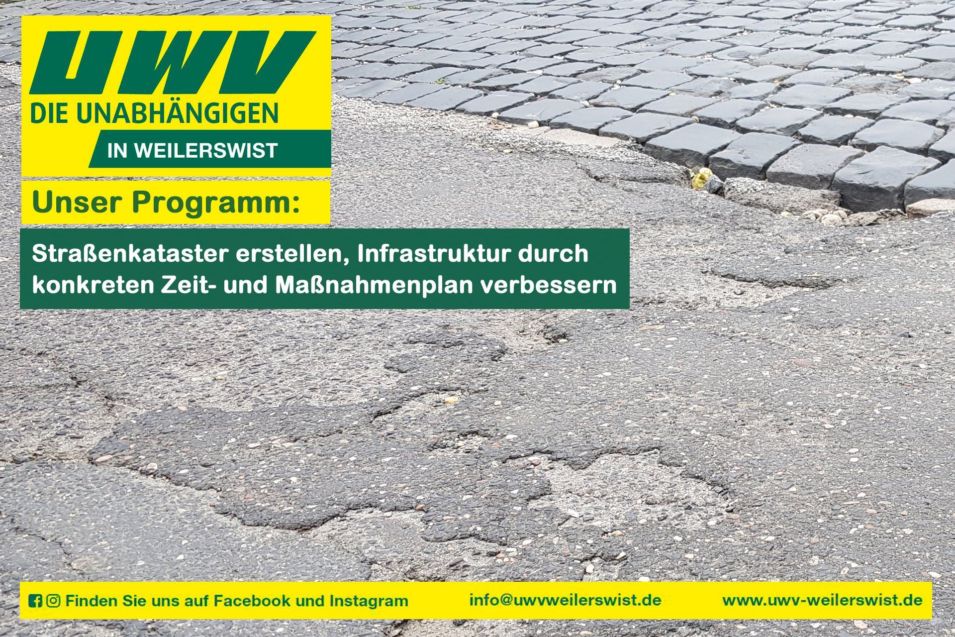 Im letzten Beitrag hatten wir ein Verkehrskonzept gefordert. Aber was ist der Verkehr ohne intakte Verkehrswege? Undenkbar. Undenkbar schlecht sind viele Verkehrswege in unserer Gemeinde. Viele Straßen und Wege sind in einem Zustand, der deutlich zu erkennen gibt, dass an machen Stellen wenig bis gar kein Geld in die Infrastruktur unserer Gemeinde geflossen ist. Hier wollen wir ansetzen. Die UWV fordert in einem ersten Schritt eine bedingungslose Analyse, welche Straßen und Wege in welchem Zustand sind. Darauf aufbauend muss einen Zeit- und Maßnahmenplan erstellt werden, wann welche Kosten anstehen bzw. welche Maßnahmen unumgänglich sind. Hier sehen wir dringenden Nachholbedarf. Alle diese Aspekte wollen wir in einem „Straßenkataster“ abgebildet wissen. Dieses Kataster muss dann auch Auskunft darüber geben, welche Ver- und Entsorgungsleitungen unterhalb der Oberfläche liegen und wann diese ebenfalls saniert werden müssen. So könnten sich einzelne Maßnahmen besser aufeinander abstimmen lassen als bisher. Der miserable Zustand vieler Verkehrsflächen ist eben nicht darauf zurückzuführen, dass Bäume mit ihrem Wurzelwerk Asphalt und Gehwegplatten heben, sondern ganz offenkundig vielmehr der Tatsache geschuldet, dass man in der Vergangenheit weniger Wert auf den Erhalt der gemeindlichen Infrastruktur gelegt hat und bisher keinen nachhaltigen Plan zur Instandsetzung und Sanierung hat. Dieser Umstand muss beendet werden, es braucht ein neues Denken damit es besser wird als jetzt. Neben den Straßen sind solche kritischen Bestandsaufnahmen mit Blick auf die Zukunft auch in anderen Bereichen der Infrastruktur erforderlich. Beispielsweise im Bereich der Schulen und Kindertagesstätten, aber auch bei Sportstätten und Erholungsflächen. Für die Herausforderungen der Zukunft, bedarf es fachlich-fundierter Konzepte. Wir wollen anderes Handeln, neues Denken in die Politik einbringen. Nur so kann es besser werden.