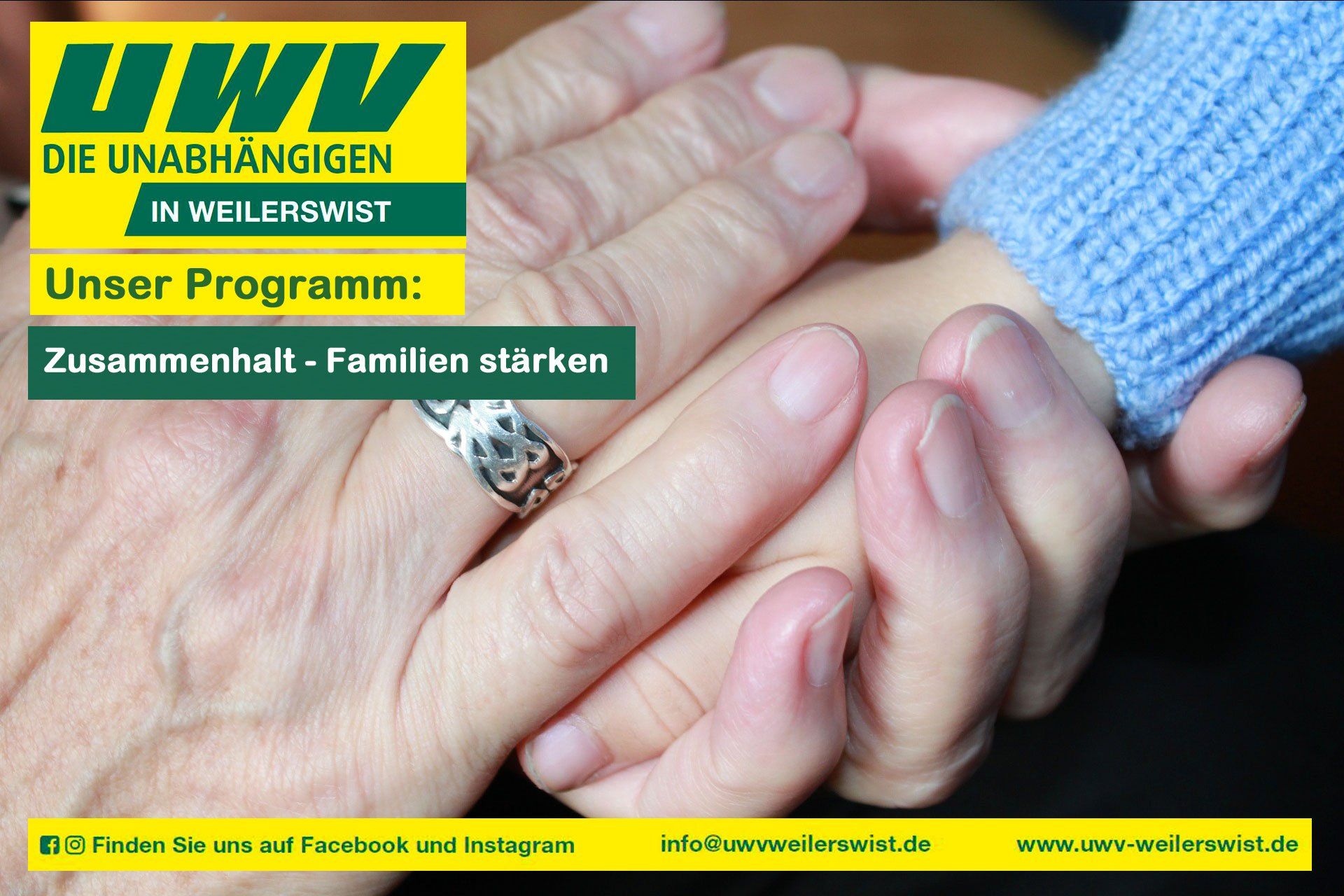 Wir wollen Familien stärken. Wir möchten, dass unsere Gesellschaft zusammenhält. Aber was heißt dies konkret? Unserer Auffassung nach kann sich eine wirkliche Stärkung von Familien und Zusammenhalt der Menschen nur aus mehreren Aspekten zusammensetzen, die ganz unterschiedliche Handlungsfelder berühren. Unter den Begriff der „Familie“ sind alle Menschen zu fassen. Die Themen erstrecken sich durch alle Bereiche unserer Gesellschaft: Von der Kita angefangen bis hin zu seniorengerechten Wohnen muss es gelingen die Situationen hier im Ort zu verbessern. Die UWV will daher stets bei allen im Rat anstehenden Entscheidungen die „Familientauglichkeit“ im Blick behalten. Beispiele: Beginnend bei den Kindertagesstätten muss in Zukunft über flexible Öffnungszeiten diskutiert werden. Vielfach erfordert die Vereinbarkeit von Familie und Beruf in der heutigen Zeit, oft bedingt durch Schichtdienste andere Betreuungsbedarfe als in der Vergangenheit. Schülerinnen und Schüler brauchen die besten Startmöglichkeiten in ihr Leben durch gute Schulen, in denen sie optimal lernen können. Dies bedeutet vor allem, dass sie insbesondere in der fortschreitenden Digitalisierung der Gesellschaft früh an die Techniken, ihrem Nutzen aber auch ihren Gefahren sorgsam geschult werden. Kinder, Jugendliche und Erwachsene benötigen für ihre Freizeit attraktive Angebote. Einladende Spielplätze, Möglichkeiten zum Treffen aber auch gute Rahmenbedingungen für die Vereine, in denen sie ihre Freizeit verbringen. Es muss vermehrt auf Barrierefreiheit geachtet werden. Diese nutzt Familien mit ihren Kinderwagen sowie Menschen, die auf Rollstuhl oder Rollatoren angewiesen sind, kurz: Menschen jeden Alters. Ältere Menschen müssen sich auch im Alter eine bezahlbare Wohnung leisten können. Benötigen Menschen Pflege, so muss ihnen diese ermöglicht werden. Zu Hause oder in einem Seniorenheim. Wenn es also heißt „Familien stärken“ und "Zusammenhalt", sehen wir als UWV einen weitreichenden, allumfassenden Ansatz, den wir verfolgen wollen um die Lebensverhältnisse zu verbessern. Wir wollen anderes Handeln, neues Denken in die Politik einbringen. Nur so kann es besser werden.