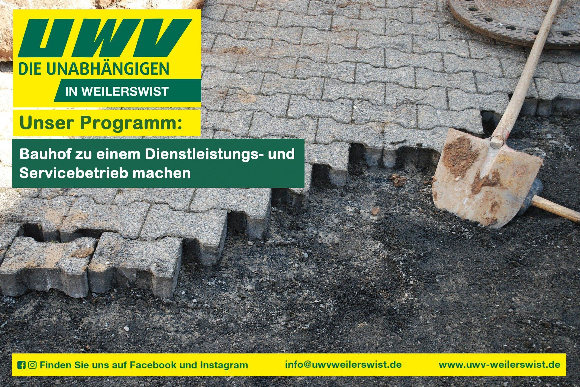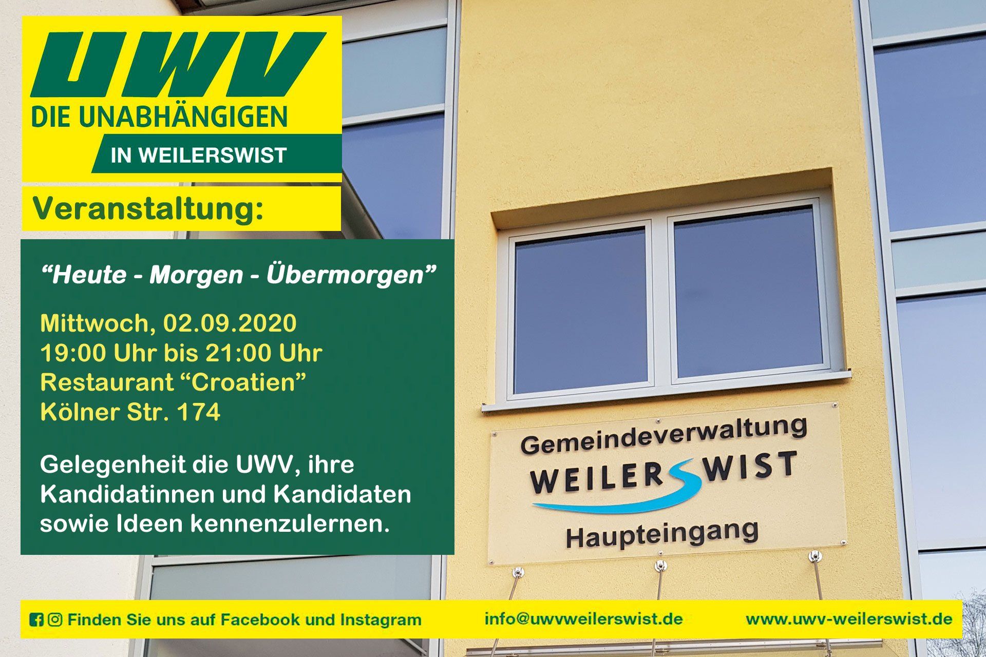 „Die Unabhängigen“ stellen sich und ihre Ideen vor: Mittwoch, den 02.09. 19:00 Uhr – 21:00 Uhr Restaurant "Croatien" Kölner Str.174 53919 Weilerswist Wir möchten Ihnen kurz vor der Wahl noch einmal die Gelegenheit geben, uns persönlich und unsere Ideen für ein besseres Weilerswist vorzustellen. In einer knapp zweistündigen Veranstaltung wird unser Vorsitzender, Uwe Wegner, dabei u. a. einen Ausblick über unsere Ideen geben: Wo stehen wir „heute“, was soll "morgen" anders sein und was wir als UWV langfristig wollen, also "übermorgen". Natürlich gelten für diese Veranstaltungen die Corona-Regelungen.