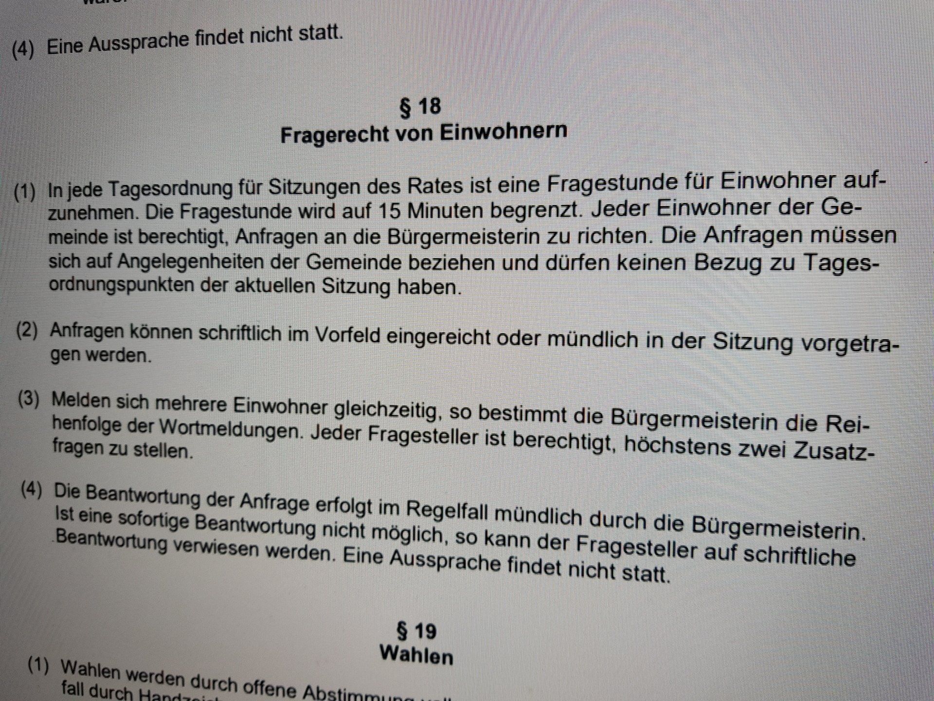 In die neue Geschäftsordnung des Rates und seiner Ausschüsse konnte die UWV-Fraktion zahlreiche Änderungen einbringen. Diese verbessern die Möglichkeiten der Einbeziehung der Bürgerschaft sowie die Transparenz in mehrfacher Hinsicht. Bestes Beispiel ist der regelmäßig wiederkehrende Tagesordnungspunkt „Einwohnerfragestunde“: Sah die bisherige Geschäftsordnung noch vor, dass Anfragen im Vorfeld schriftlich eingereicht werden mussten, sah der ursprüngliche Vorschlag aus dem Rathaus für die neue Geschäftsordnung deutlichere Hürden für die Bürger vor. So hieß es im Vorschlag der Verwaltung: „Anfragen sind mindestens drei Werktage vor dem Beginn der Ratssitzung schriftlich einzureichen und von den Fragestellern mündlich vorzutragen.“ Dank der Initiative der UWV-Fraktion konnte hier eine deutliche Verbesserung zu Gunsten der Bürgerschaft erzielt werden. Künftig müssen die Fragen keineswegs mehr schriftlich im Vorfeld eingereicht werden. Zwar ist aus Gründen der Praktikabilität die Zeit für diesen Tagesordnungspunkt auf 15 Minuten begrenzt, aber die Hürde für die Menschen, sich aktiv einzubringen ist deutlich gesenkt worden. UWV-Ratsmitglied Matthias Müller dazu: „Es gibt aus unserer Sicht keinen Grund, warum man Menschen - wie bislang – zu einer schriftlichen Formulierung Ihrer Anfragen drängen sollte. Diese Hürde musste weg. Man muss akzeptieren, dass es manchen Menschen vielleicht schwer fällt, ihre Anliegen schriftlich zu formulieren oder ihnen der Aufwand schlichtweg zu umständlich-groß ist. Diesem wollten wir im Sinne einer einfachen und praktikablen Lösung Rechnung tragen.“ Übrigens: die Verwaltung bezog sich hinsichtlich der Notwendigkeit zur Änderung der Geschäftsordnung auf die Muster-Geschäftsordnung des Städte- und Gemeindebundes NRW. Dadurch haben z. B. nun viele Aspekte des Datenschutzes ihren Weg in die Weilerswister Geschäftsordnung gefunden. Generell argumentierte man aus der Verwaltungsspitze heraus, man habe sich generell an den Formulierungen des Städte- und Gemeindebundes orientiert. In Sachen Einwohnerfragestunde entstammte der Beschlussvorschlag aber keineswegs dieser Muster-Geschäftsordnung. Hier ist die zusätzliche Hürde einer vorherigen, schriftlichen Formulierung der Fragen, samt entsprechender Fristsetzung nicht aufgeführt. „Die Gedanken, warum dies von der Bürgermeisterin offensichtlich anders gewollt war, sind frei“; kommentiert Marion Leufer, die stellv. Fraktionsvorsitzende der UWV. Die neue Geschäftsordnung finden Sie hier als PDF-Dokument a uf der Seite der Gemeinde Weilerswist. (UW)