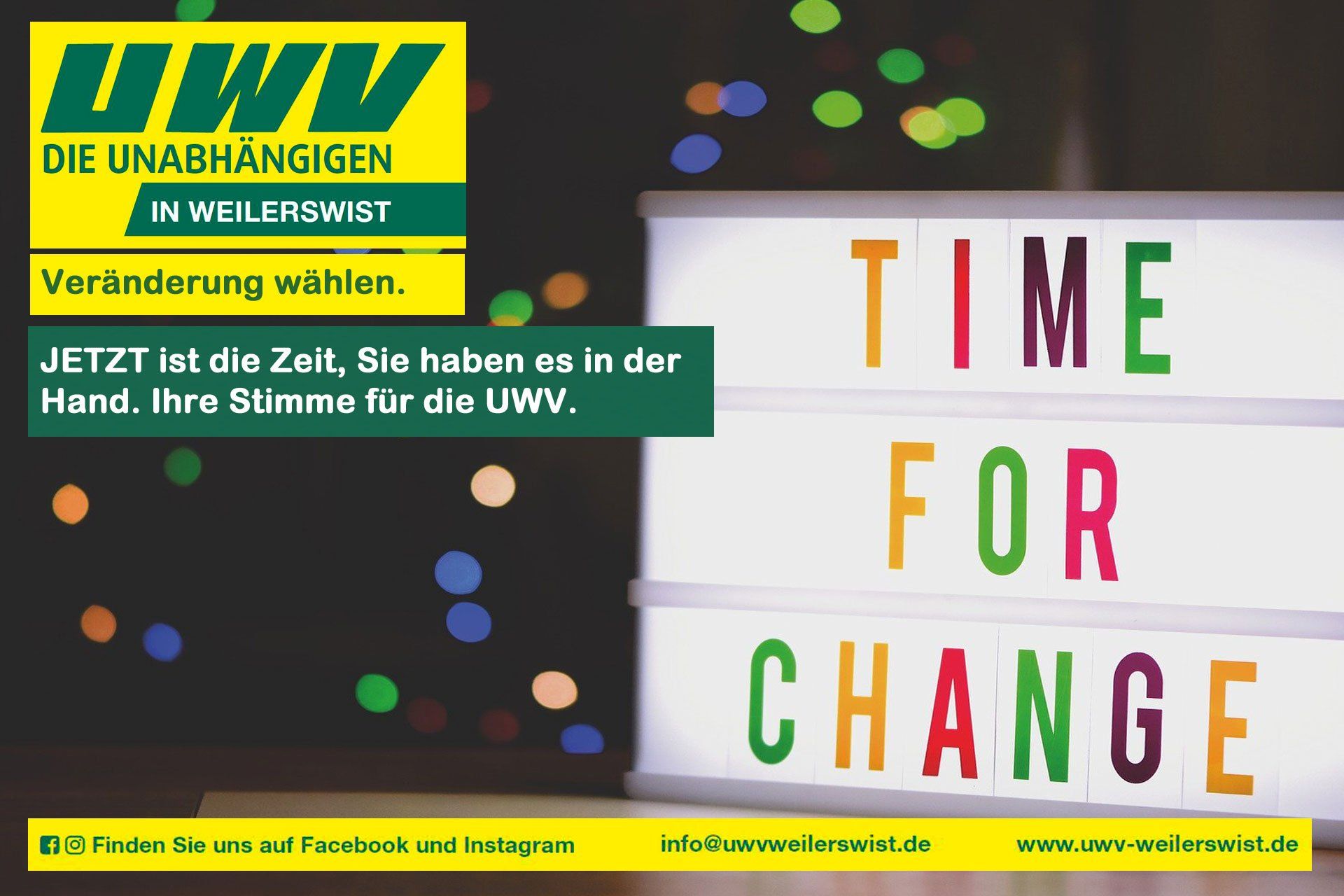 Vor nicht einmal einem Jahr, haben sich in unserer Gemeinde ein paar Menschen zusammengefunden und die „Unabhängige Wähler-Vereinigung“ (UWV) in Weilerswist gegründet. Ein Projekt, welches hätte scheitern können, sich jedoch mehr als positiv entwickelt hat. Kurz nach der Gründung waren eine informative Homepage, eine facebook-Seite sowie ein Instagram-Account geschaffen. Vor allem gelang es in kürzester Zeit nicht nur ein umfangreiches Thesenpapier zu entwickeln, sondern dieses auch noch, beginnend im Januar, bei mehreren Veranstaltungen öffentlich zur Diskussion zu stellen. Hieraus entwickelte sich ein umfangreiches Wahlprogramm, welches im März verabschiedet wurde. Neue Mitglieder wurden gewonnen, alle Wahlbezirke in der Gemeinde personell besetzt und wir wurden zur Wahl zugelassen. Die bürokratischen Hürden haben wir gemeistert. Wir haben regelmäßige Pressemeldungen herausgegeben. Seit Anfang Mai haben wir in einzelnen Themenpostings unsere Ideen und Ziele vorgestellt, nicht erst in den letzten vier Wochen oder wenigen Tagen vor der Wahl. Wir haben alle unsere Kandidatinnen und Kandidaten einzeln vorgestellt. Und auch in diversen Kommentaren und Diskussionen, sowohl real als auch virtuell, fand die UWV trotz der Corona-Pandemie weiterhin deutlich statt. Gerne hätten wir mehr Veranstaltungen und noch weitere Ideen umgesetzt, aber wir waren leider vielfach fremdbestimmt und wollten vor allem keine Gäste in potentielle Gefahr bringen. Zudem haben wir als UWV mit unserem Informationsblatt „Weilerswist kompakt“ weitere Aufmerksamkeit auf uns gezogen. Von den bisherigen vier Ausgaben haben wir drei davon sogar als Print-Version in alle Haushalte verteilen lassen. Trotz aller widrigen Umstände und manchem Gegenwind aus Reihen der politischen Mitbewerber, sehen wir uns heute gut gerüstet für den Wahltag, für diesen Sonntag. Wir haben bis hierhin schon einiges erreicht und auf zahlreiche Themen so aufmerksam gemacht, dass so manche politischen Mitbewerber diese nun ebenfalls für wichtig erachten und sich auf die Fahne schreiben: mehr Transparenz und Bürgerbeteiligung, ein Verkehrskonzept, ein Infrastrukturkonzept, mehr Grün für unsere Gemeinde, bezahlbares Wohnen, Stärkung von Familien, Förderung des Ehrenamtes und der Vereine, „Modelling of Excellence“, etc; Noch mehr freuen wir uns aber über zahlreiche Rückmeldungen aus der Bürgerschaft. Wir haben sehr viel Zustimmung erfahren dürfen. Ebenfalls sehen wir uns in einer Sache bestätigt: der Wunsch nach inhaltlichen, sachlichen Diskussionen der Weilerswister Bürgerschaft ist vorhanden. Es lassen sich viel mehr Menschen als bisher für Themen interessieren. Viele sind bereit, sich mit Ihrem Wissen einzubringen. Darauf wollen wir auch zukünftig bauen. Wir danken schon jetzt an dieser Stelle allen Menschen, die uns auf unterschiedlichen Wegen ihr Feedback gegeben haben. Sie sind und bleiben Richtschnur unseres Handelns. So wünschen wir es uns für den künftigen Gemeinderat. Wir wissen aber auch: Stimmungen sind jedoch noch lange keine Stimmen. Es reicht nicht, sich zu Wort zu melden, man muss auch wählen, damit Veränderungen eine Chance haben. Geben Sie der Chance eine Stimme. Ihre Stimme für die UWV!