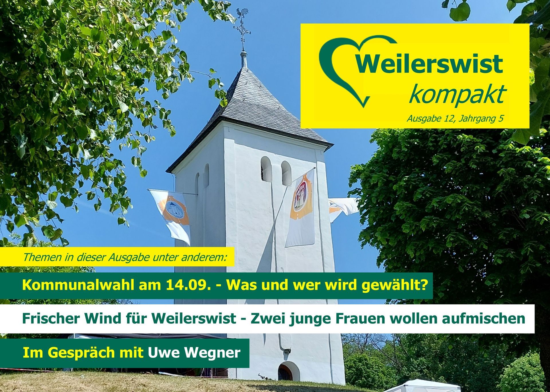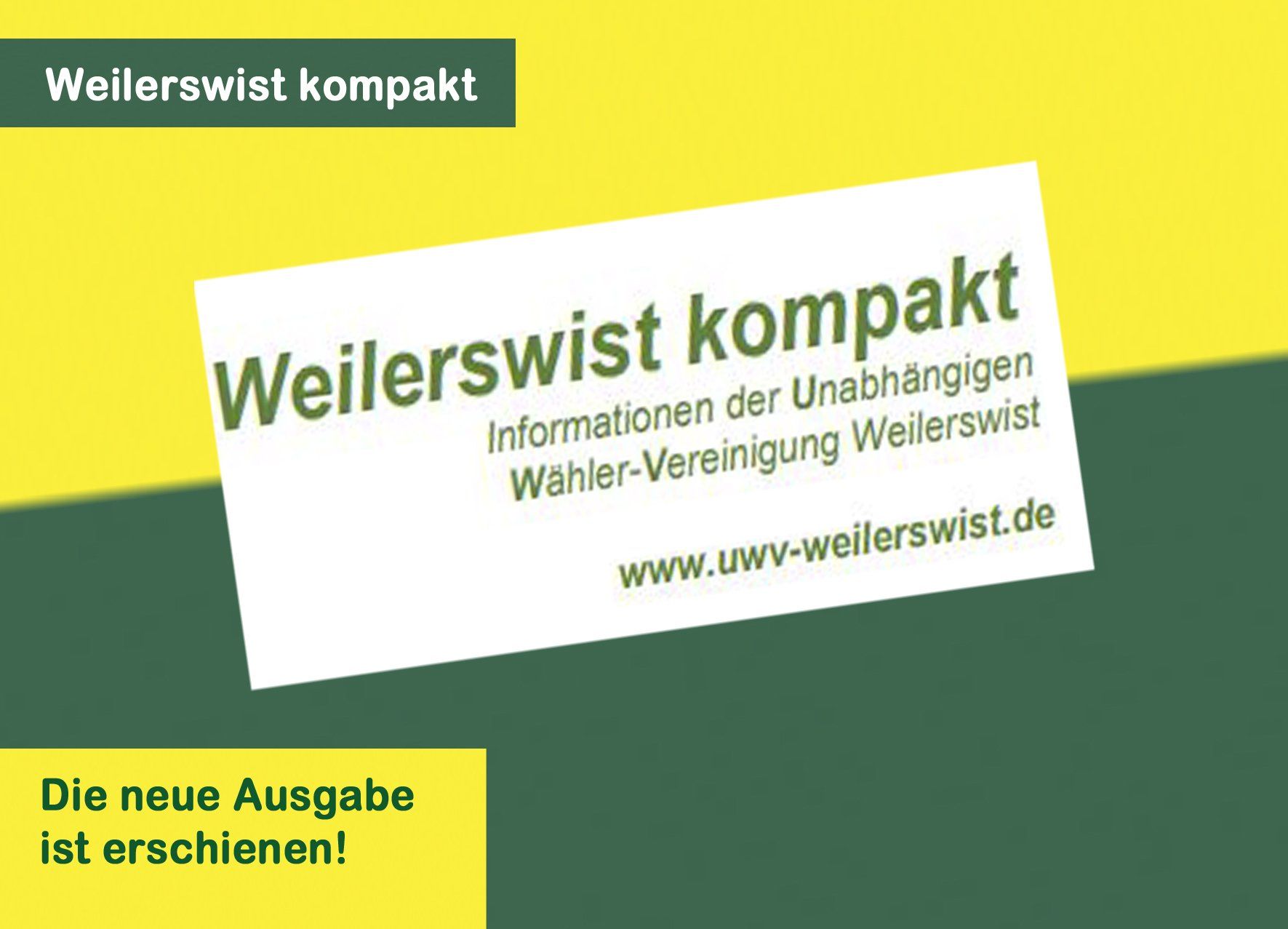 Die dritte Ausgabe von "Weilerswist kompakt" ist heute erschienen und landet dieses Wochenende in allen Weilerswister Haushalten. Themen in dieser Ausgabe: Was die Unabhängige Wähler-Vereinigung von Parteien unterscheidet UWV strebt stärkere Bürgerbeteiligung und mehr Transparenz an Infrastruktur auf den Prüfstand stellen und Perspektiven entwickeln Herausforderungen an die Schullandschaft Unsere Köpfe - Ihre Kandidaten Laden Sie die neue Ausgabe hier als PDF herunter: